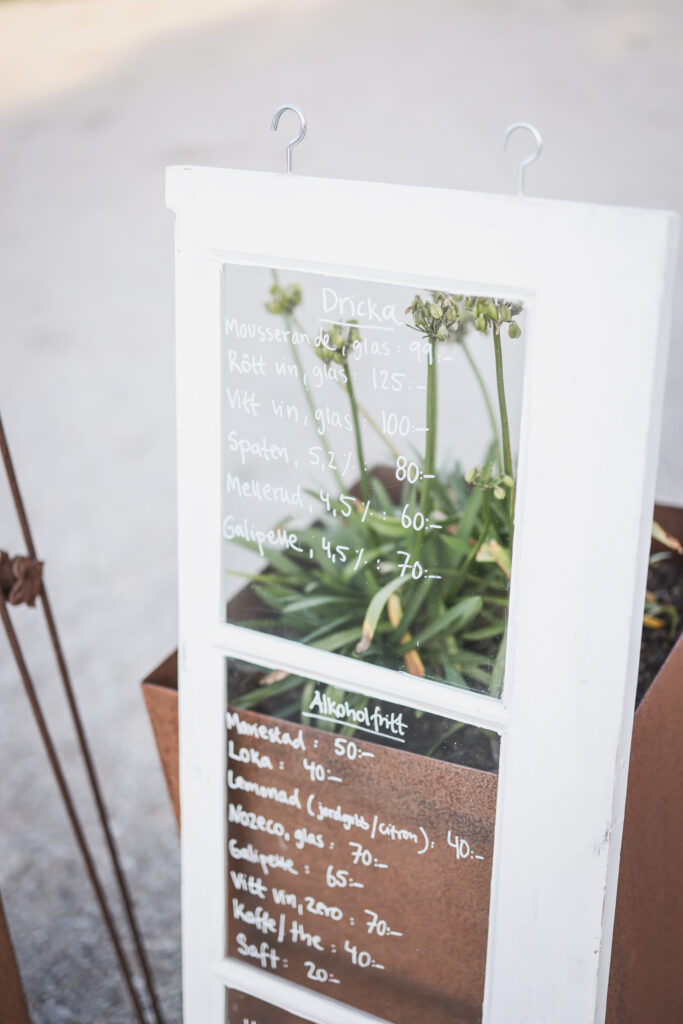 Vad som serveras till middag håller vi hemligt fram till kvällen. Menyn formas av säsongen, råvarorna och känslan i köket den dagen – och presenteras för er steg för steg under kvällen.